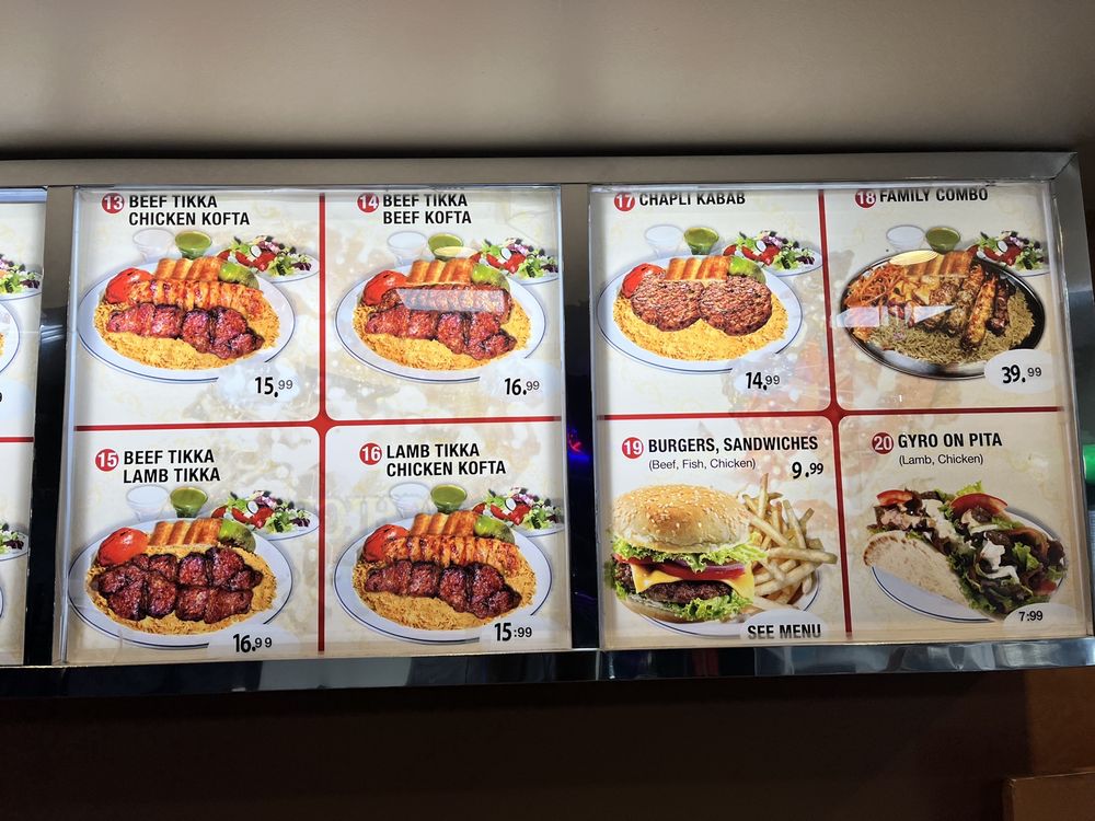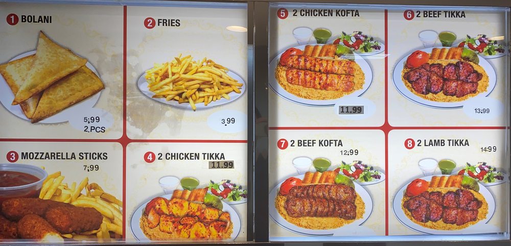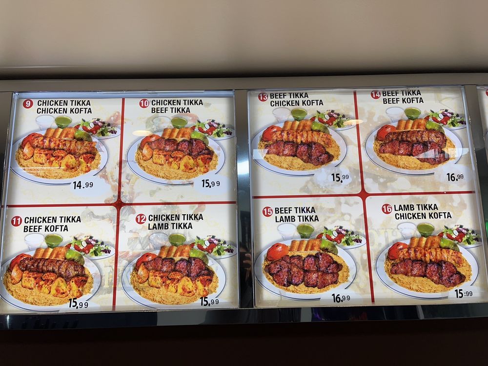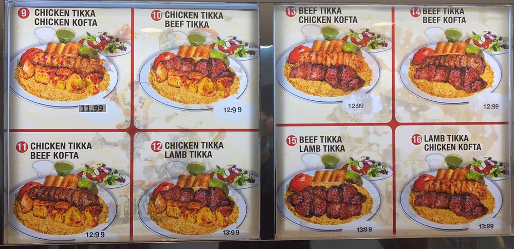 2 chicken tikka, 2 beef kofta, 1 beef tikka, and 1 chicken kofta. Served with afghan rice, salad, and afghan naan. (Rice topped with cooked carrots and raisins).